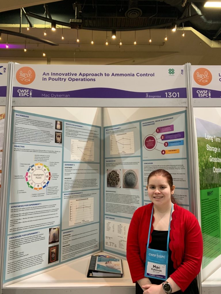 Mac’s project aims to determine if Prussian Blue or Prussian Blue + Biochar can be used as a commercially viable bedding additive to adsorb ammonia from chicken bedding.