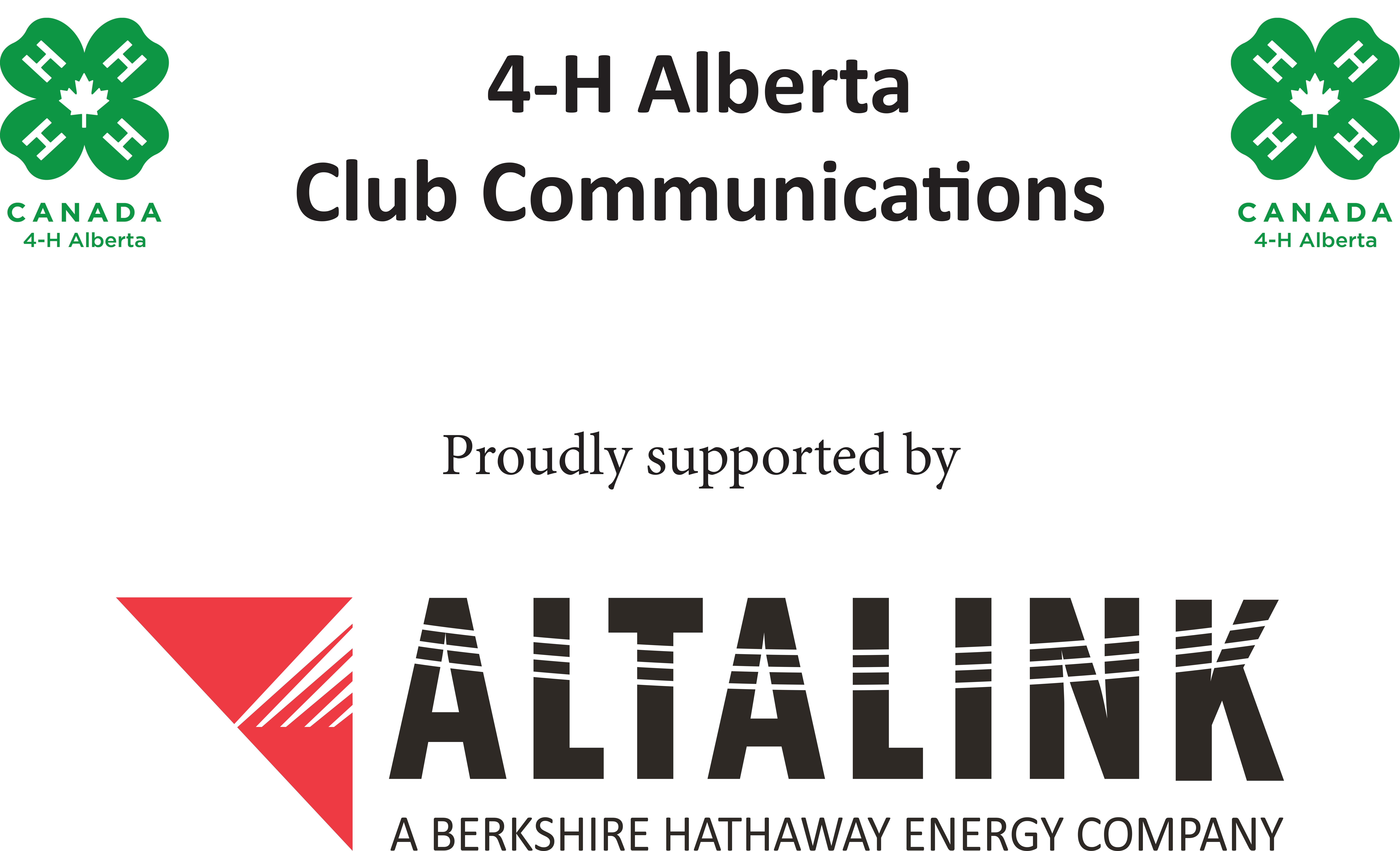 As you prepare for your upcoming Club Communication Competition, we are pleased to let you know that AltaLink will continue their generous support of 4-H Alberta’s Communications program and will remain the sole Communications sponsor across all Club, District, Region, and the Provincial competitions.