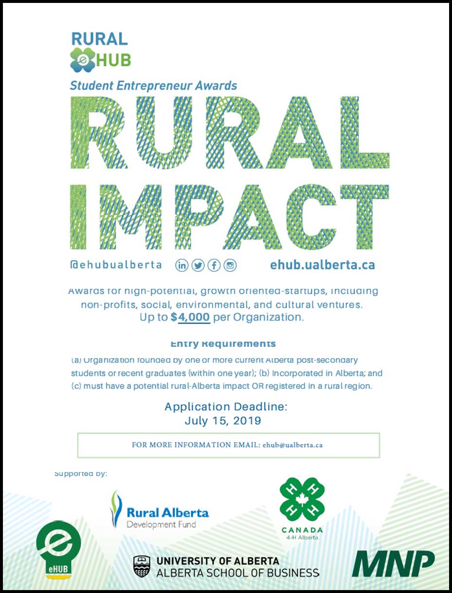 Rural eHUB’s Student Entrepreneur Awards (up to $4,000 per company) are competitive, one-time, direct awards to post-secondary students or recent graduates (within one year of post-secondary) of high-potential, growth oriented-startups that impact rural Alberta. This includes businesses, non-profits, social, environmental, and cultural ventures, that are either born-rural or have rural-Alberta impact.